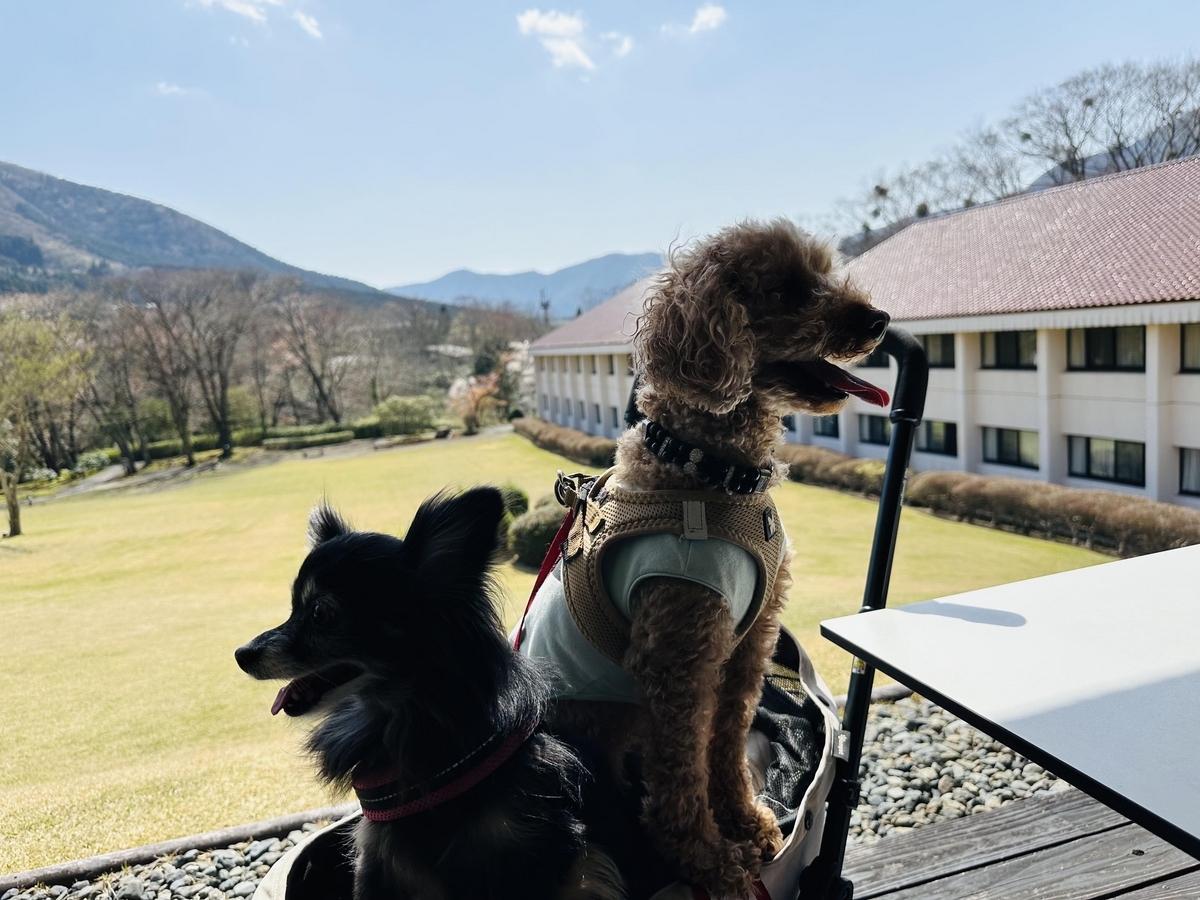 ロビーがある本館から渡り廊下を歩き、少し離れた場所にあるドッグフレンドリールームへ。まだ桜が咲いている時期でした♪