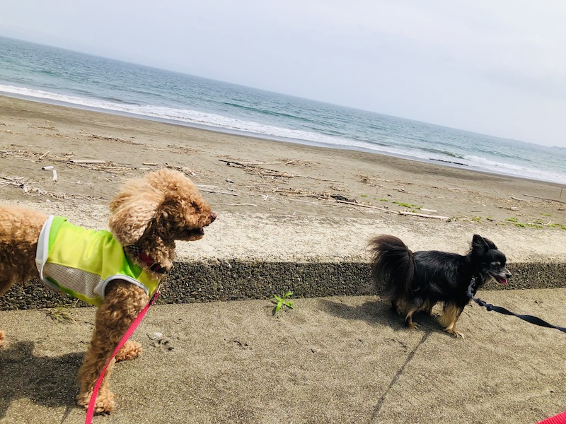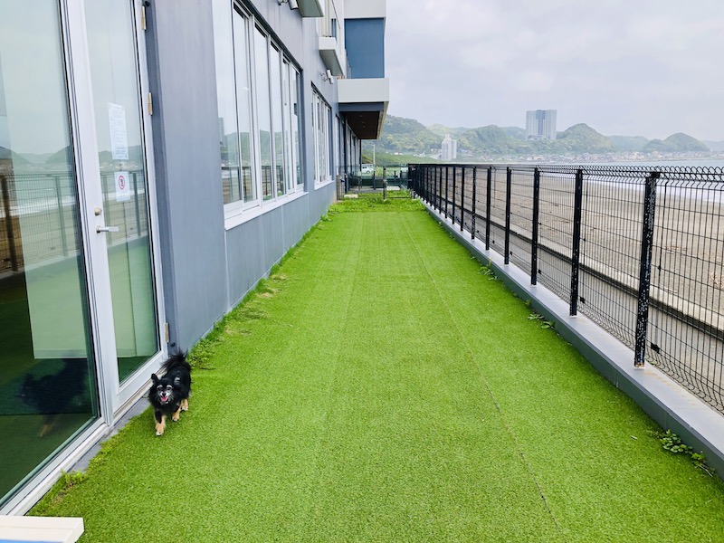 海沿いに人工芝のささやかなドッグランがあります。小型中型犬には十分だけど、大型犬には物足りない広さ。ただ目の前が海辺なので、走りたい子はロングリードで外へ行きましょう♪