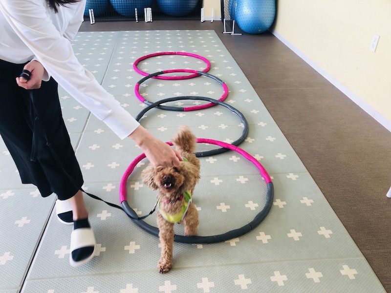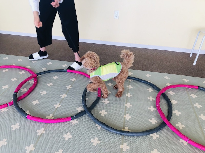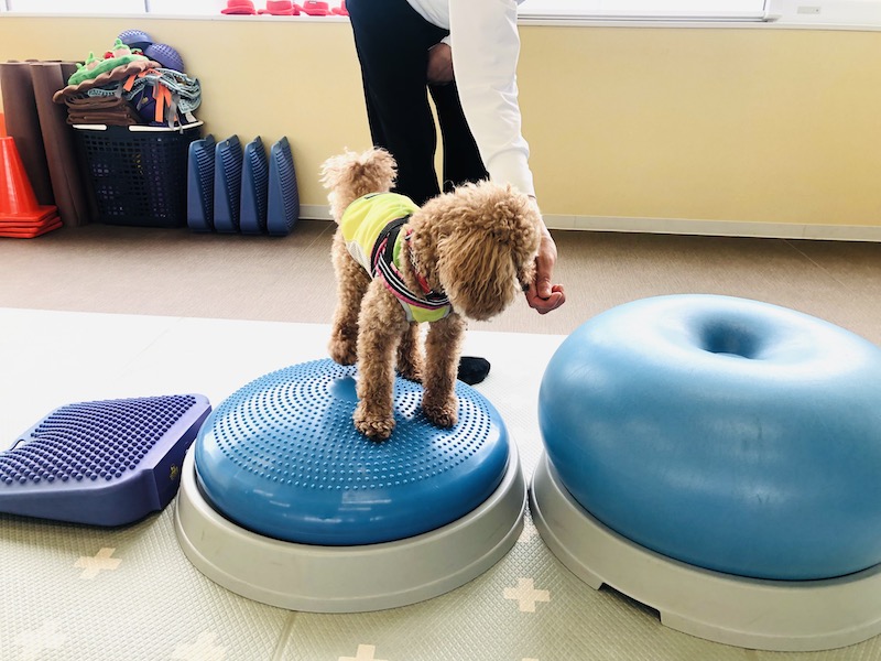 犬のリハビリテーションを目的とした内容で「バランスボール」「アクアフィットネス」のプログラムから選べます。トイプーのチョコ太は「バランスボール」を体験!