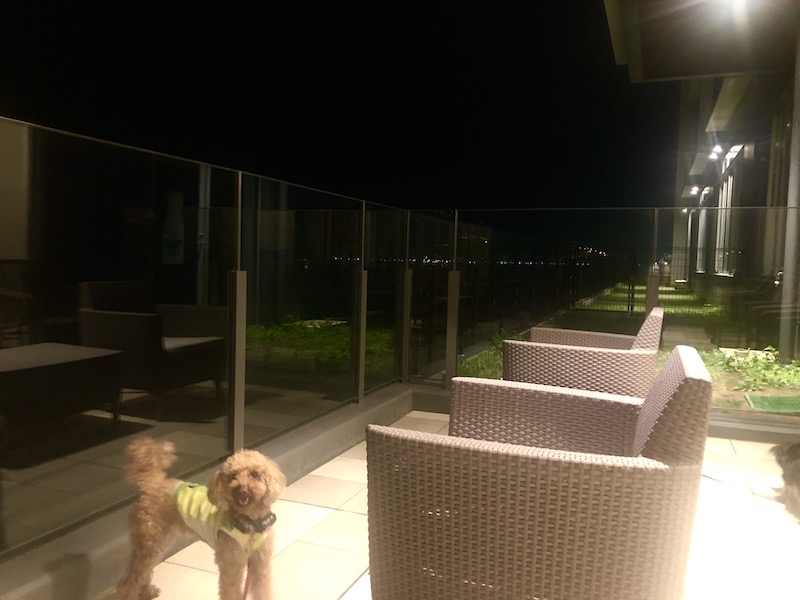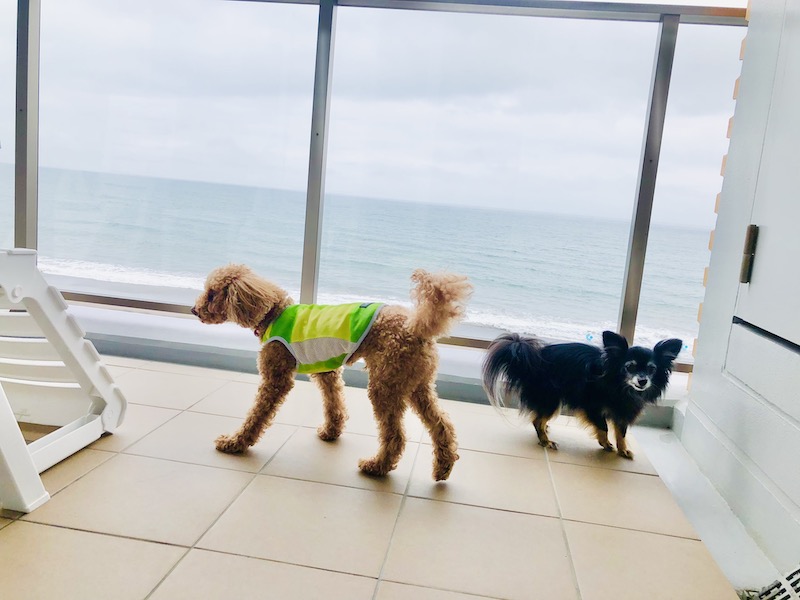 オシャンビューのテラスを散策するわんこたち。波と風の爆音にちょっと緊張気味?