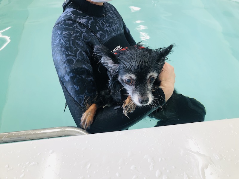 次。チワワmixのレモンは「アクアフィットネス」も体験!屋内プールにスタッフの方と泳ぎを習います。