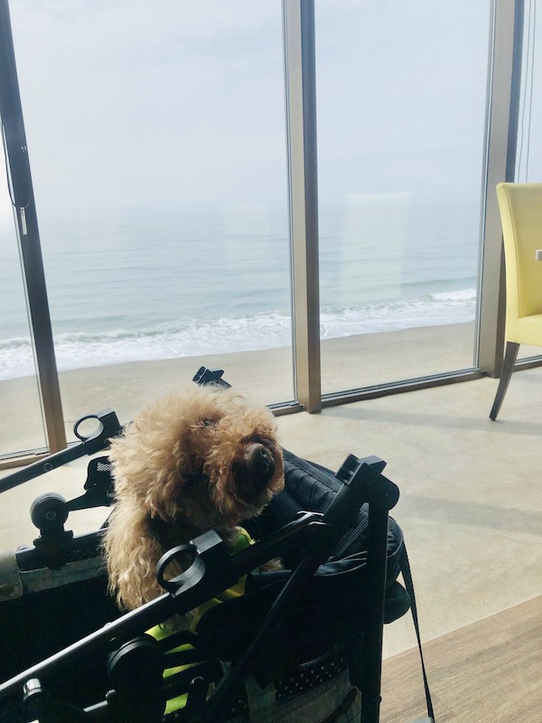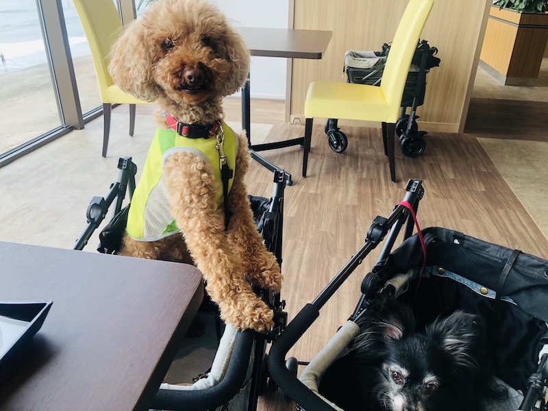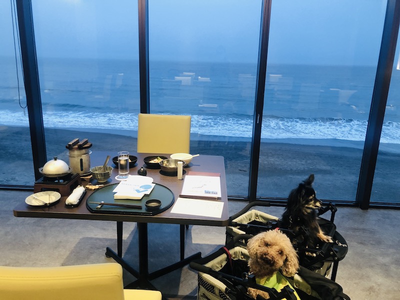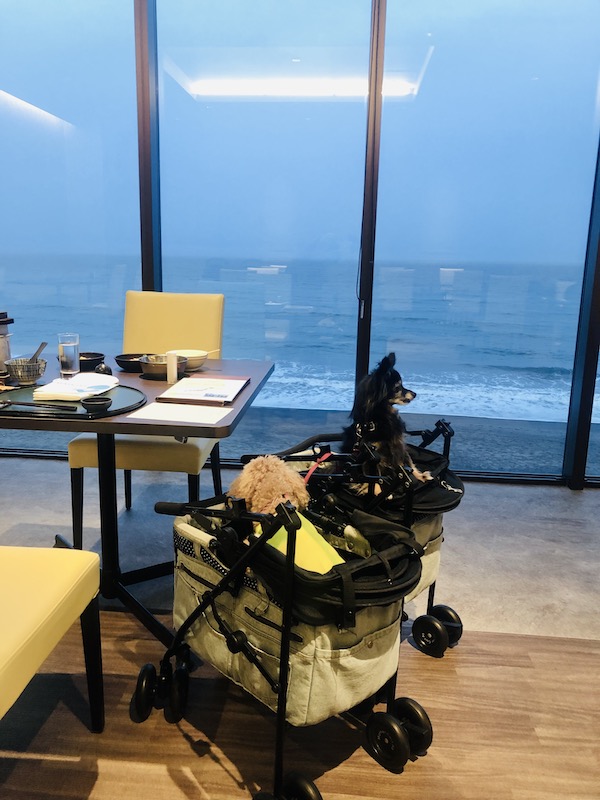 全面ガラスからは夜の海が(*’∀’人)♥* 席にはわんこたちのバギーが用意してありました。