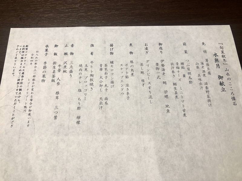 人のメニューはこちら♪ 懐石料理なので、次から次へとおいしい料理が運ばれます。