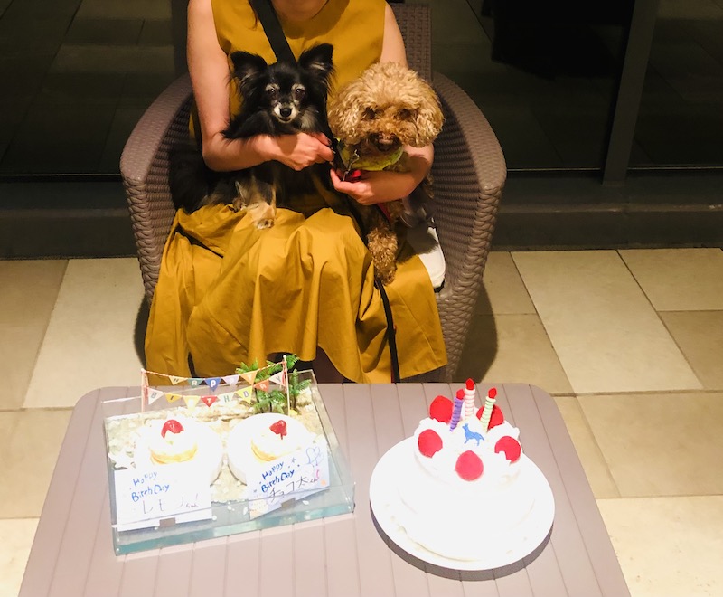 2頭のケーキ(右)にスタッフさん手書きのカード。ありがとございます!