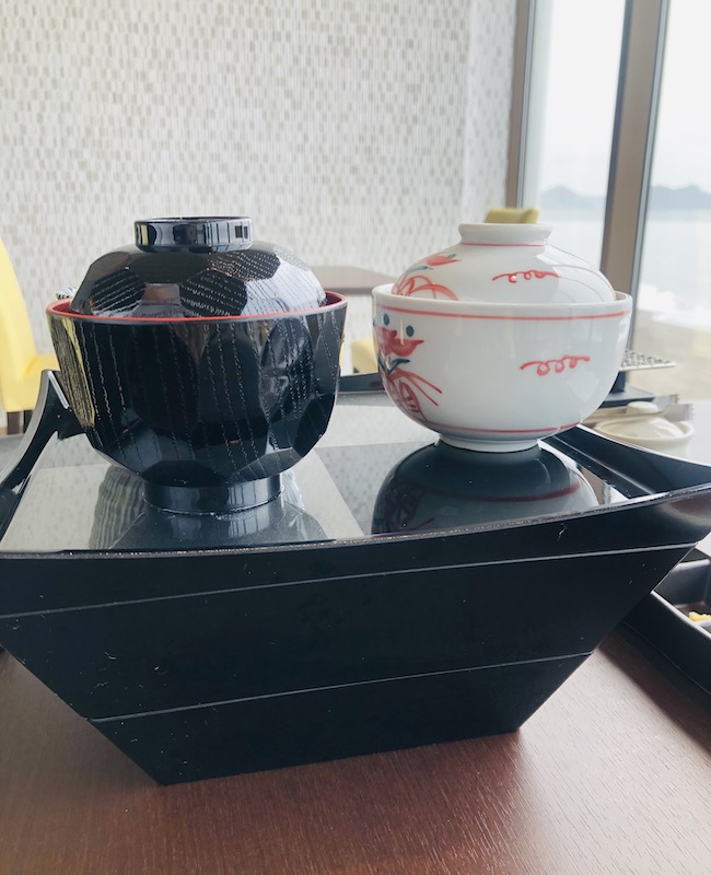 3段の御重を開くスタイルでした。飲み物はセルフでオレンジジュースやコーヒーが。